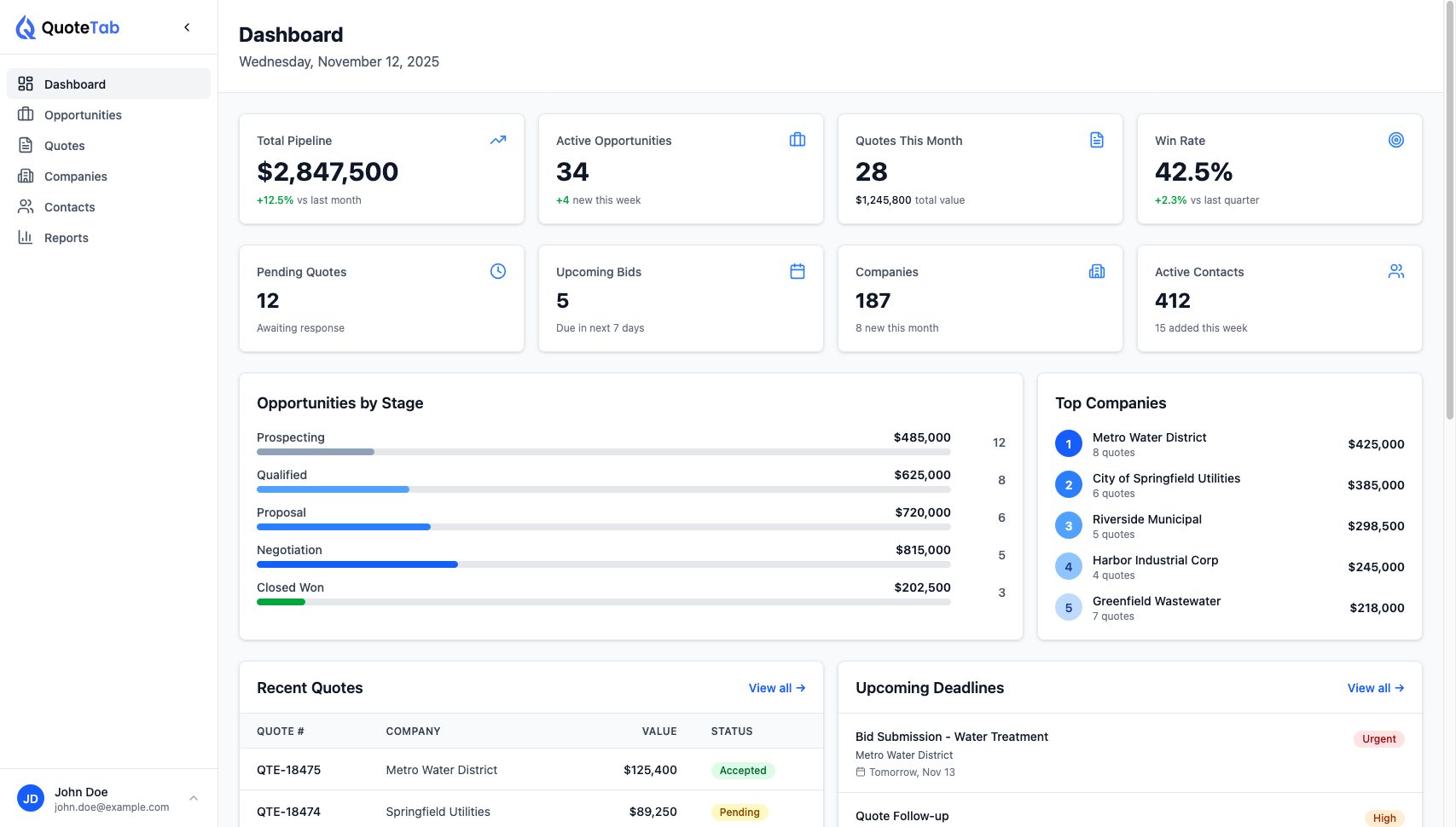 Purpose-built tools for water infrastructure sales. Quote Tab streamlines quoting, project management, and profitability.