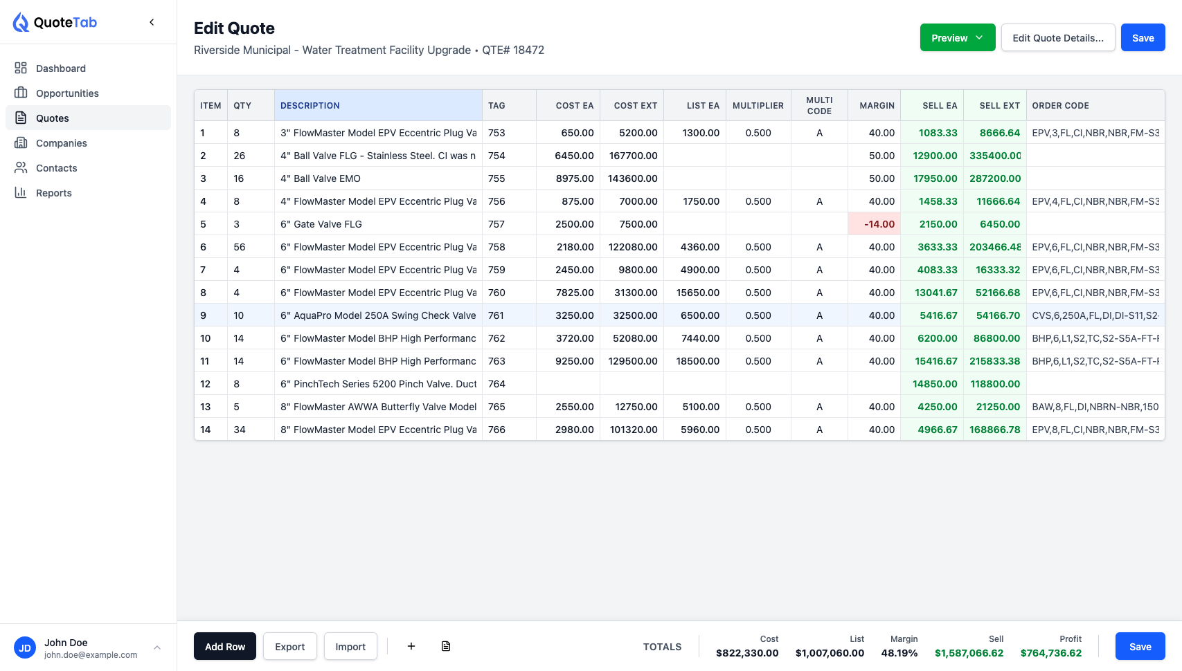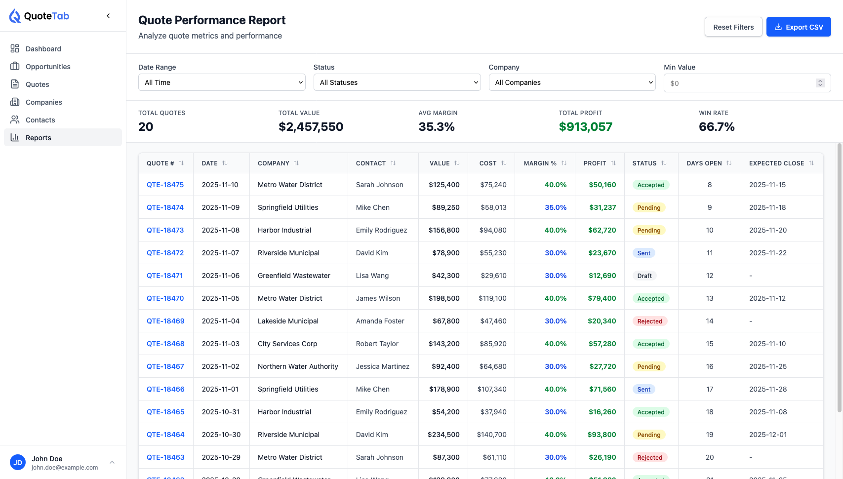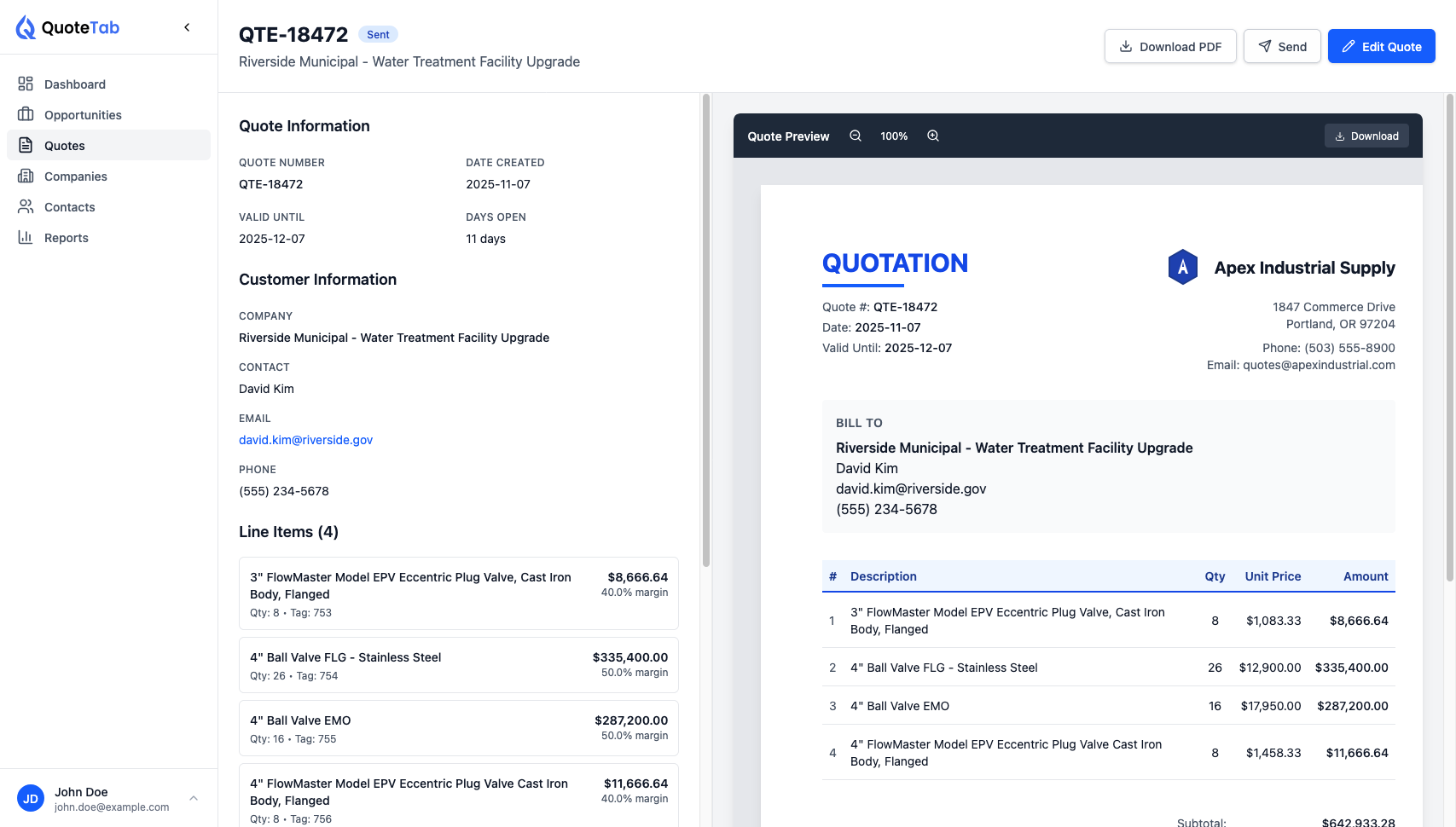 Purpose-built tools for water infrastructure sales. Quote Tab streamlines quoting, project management, and profitability.